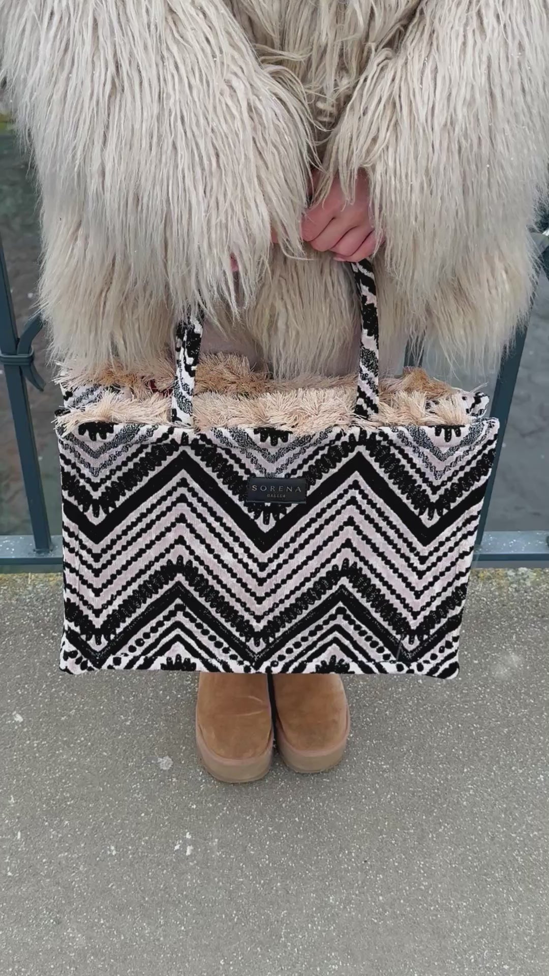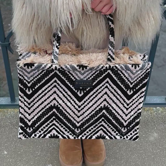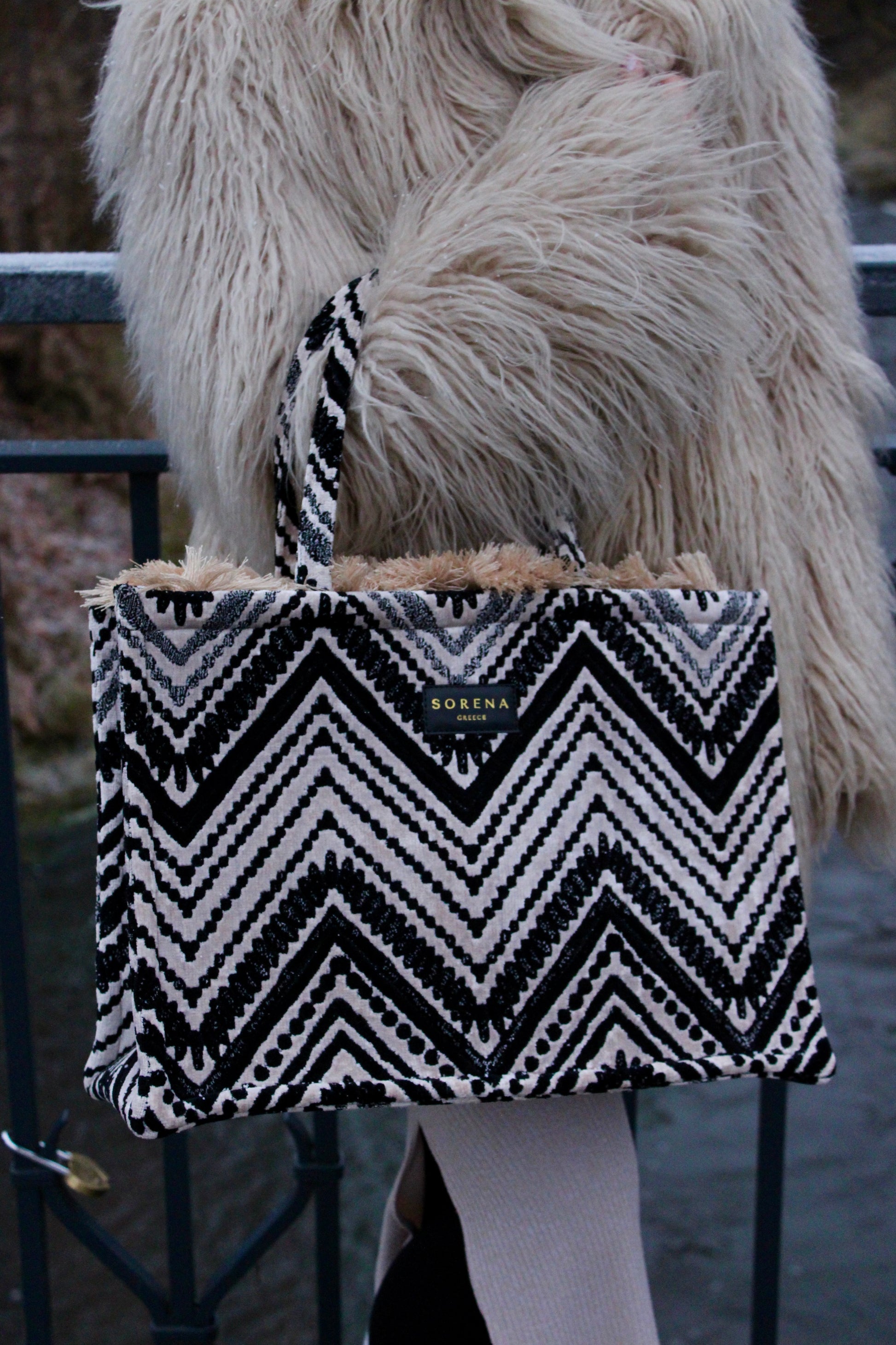 Large tote bag decorated with geometric patterns. Handmade piece, created with special care and attention to detail. The interior is decorated with luxurious red velvet lining, which gives it exclusivity and elegance. Perfect for leisure and walks in the city.