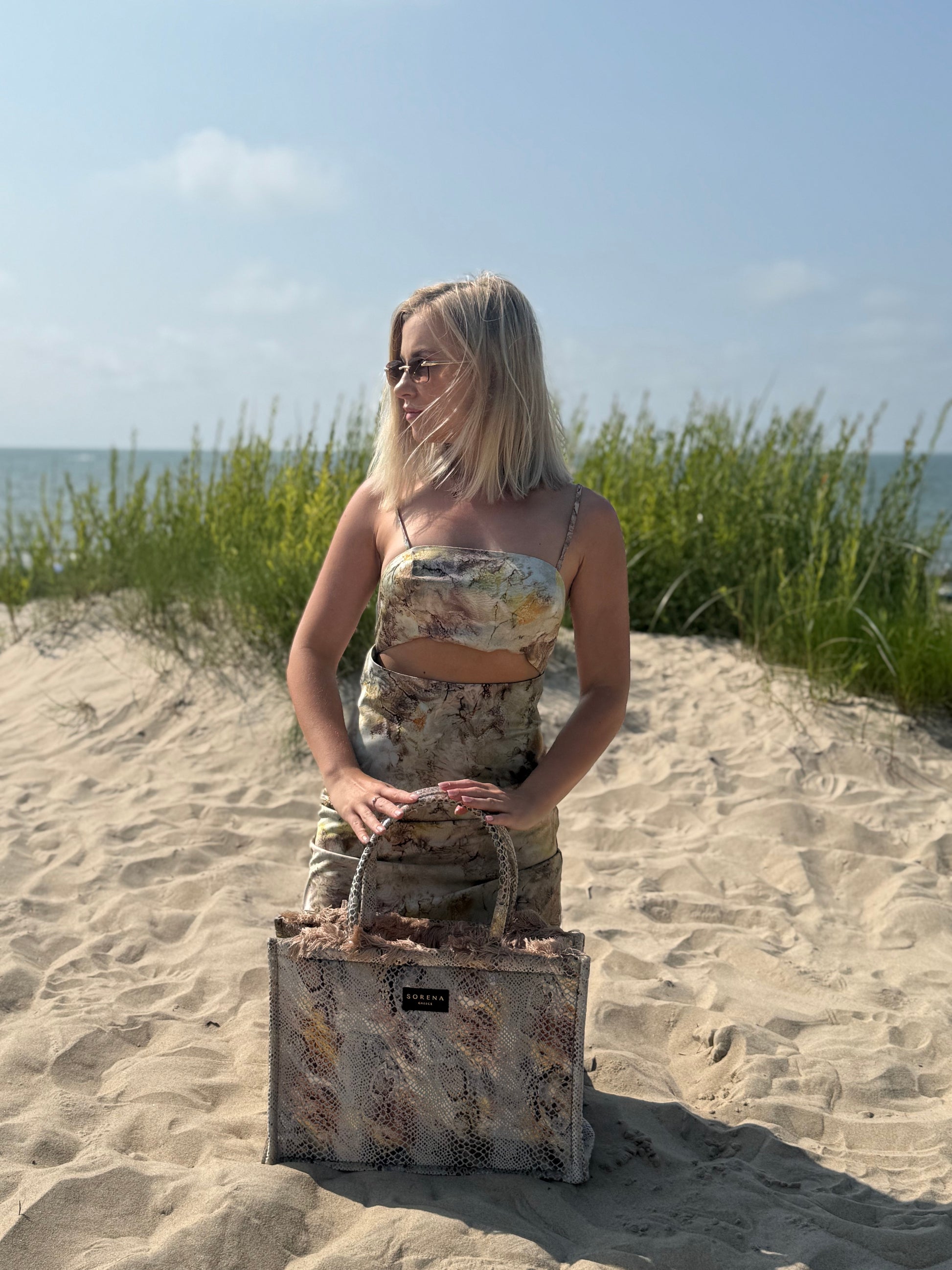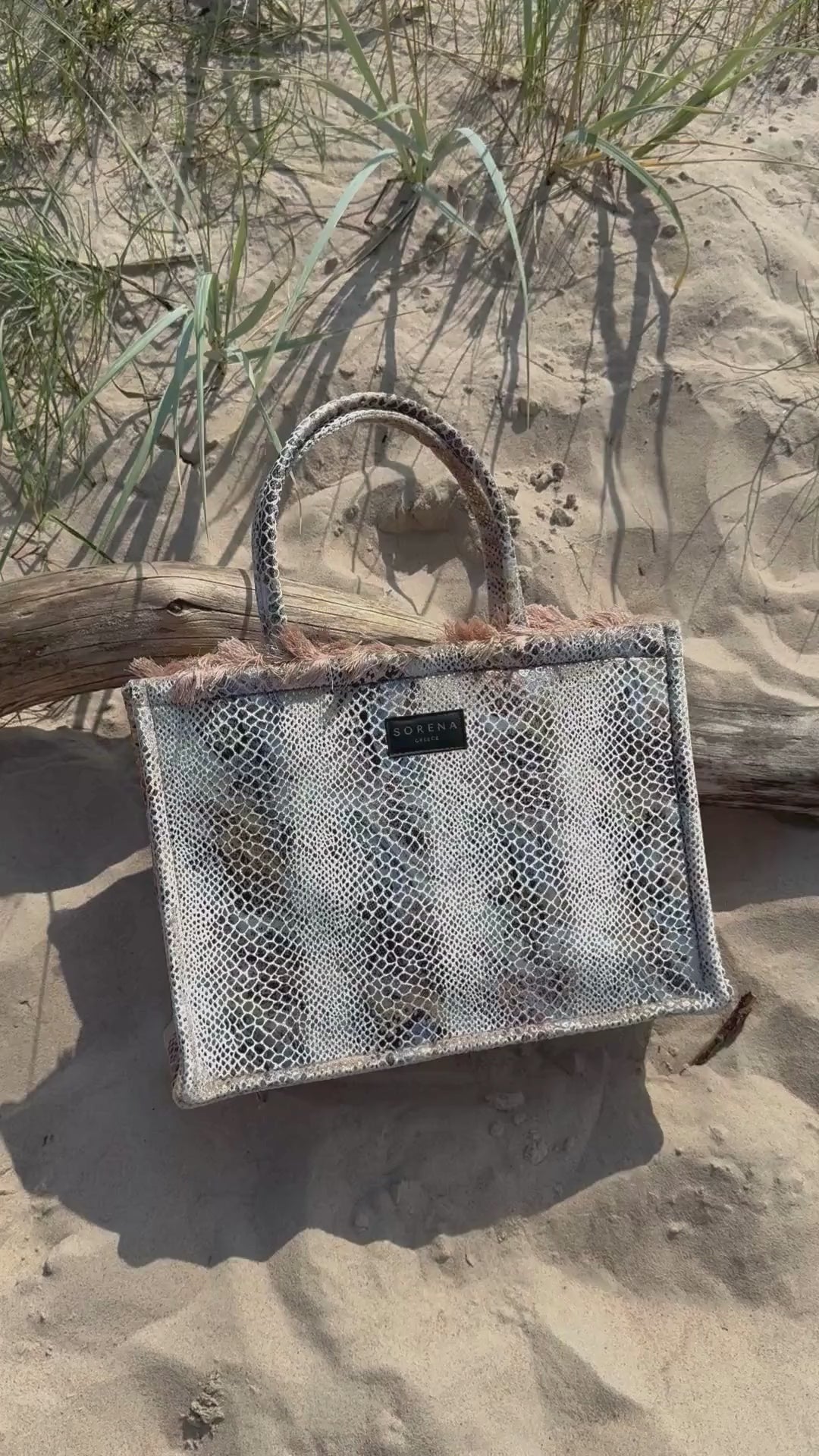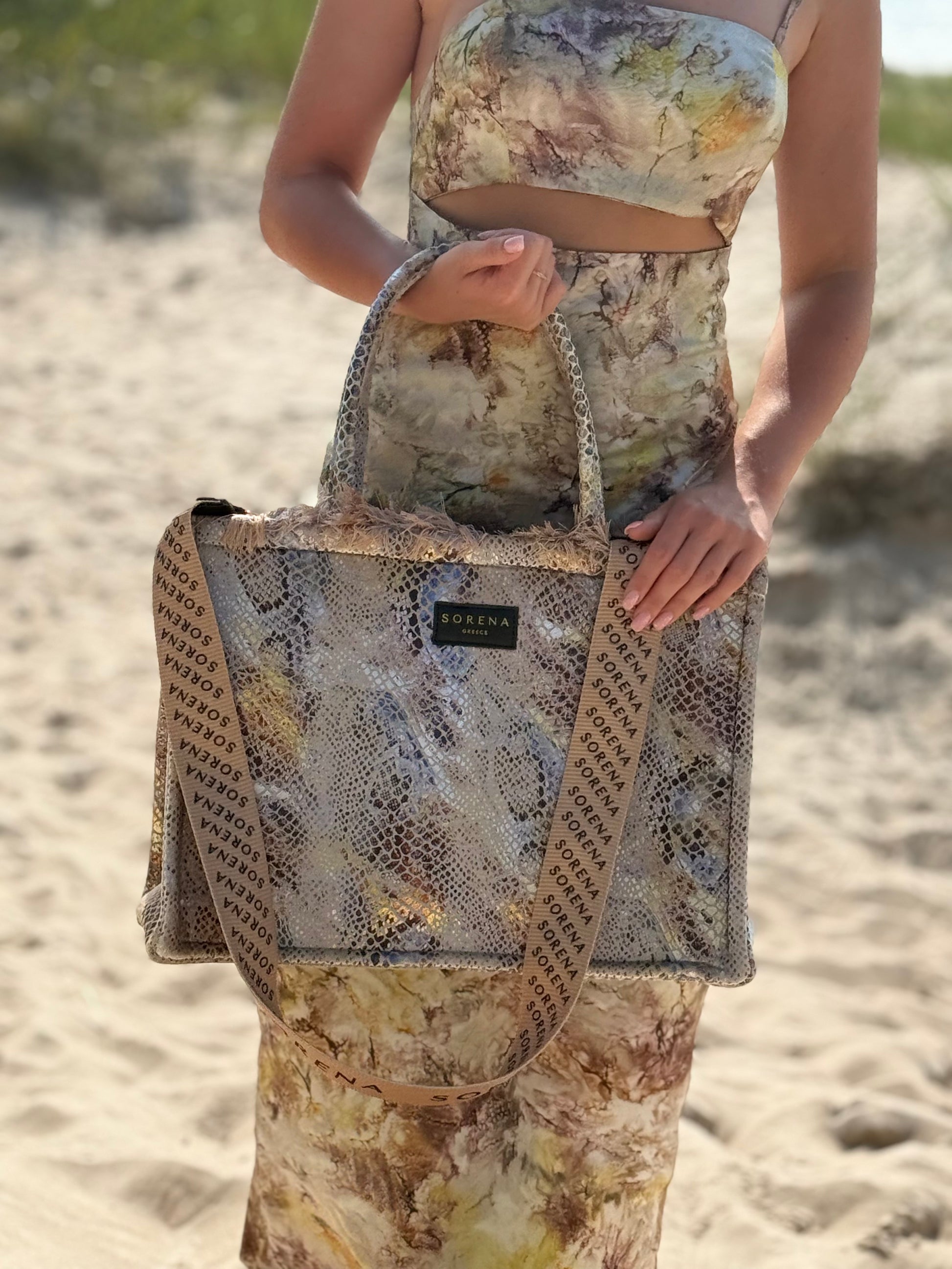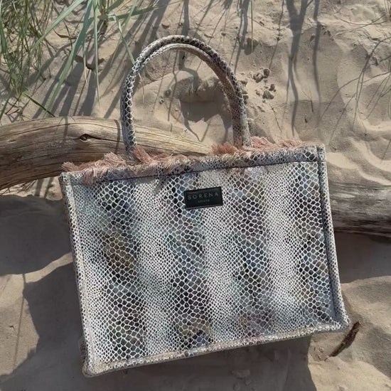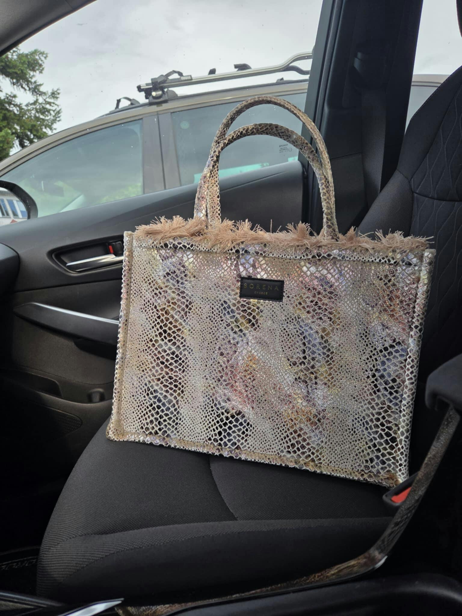Large tote bag decorated with a snakeskin pattern. Handmade piece, created with special care and attention to detail. The interior is decorated with luxurious red velvet lining, which gives it exclusivity and elegance. Perfect for leisure and walks in the city.